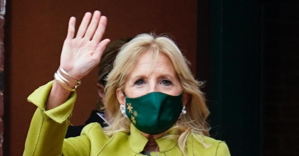 The first lady left Banks’ Seafood Kitchen in a gray midi dress. The piece was cinched beneath a brown belt and layered under a light green jacket. Biden coordinated her accessories with her belt’s gold buckle, pairing it with gold bracelets. She completed her look with a dark green mask, as well as sparkling statement earrings.