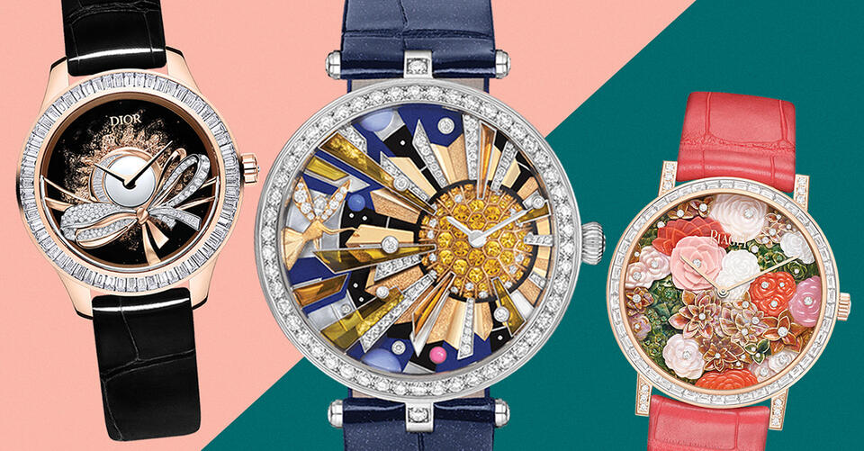 Plique-à-jour enameling first used 1,500 years ago creates a stained-glass effect on the dial of the Petite Heure Minute Smalta Clara Hummingbird, with an off-center dial in mother-of-pearl and 100 diamonds on the 35mm red-gold case; limited to eight pieces, price upon request, at Feldmar Watch Company, Los Angeles, and jaquet-droz.com.